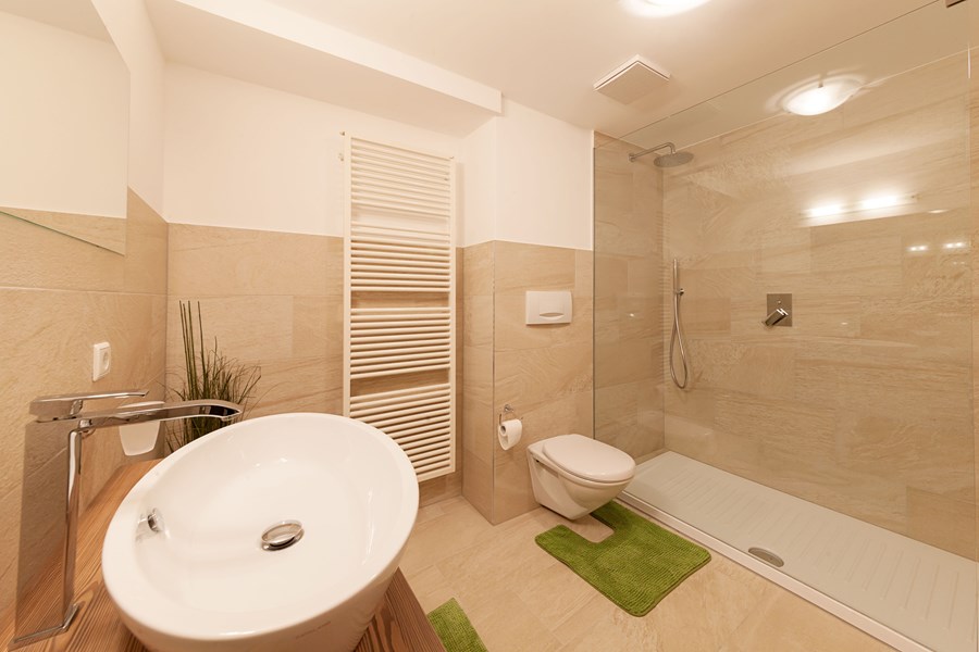- bagno moderno con doccia a pioggia, WC e asciugacapelli